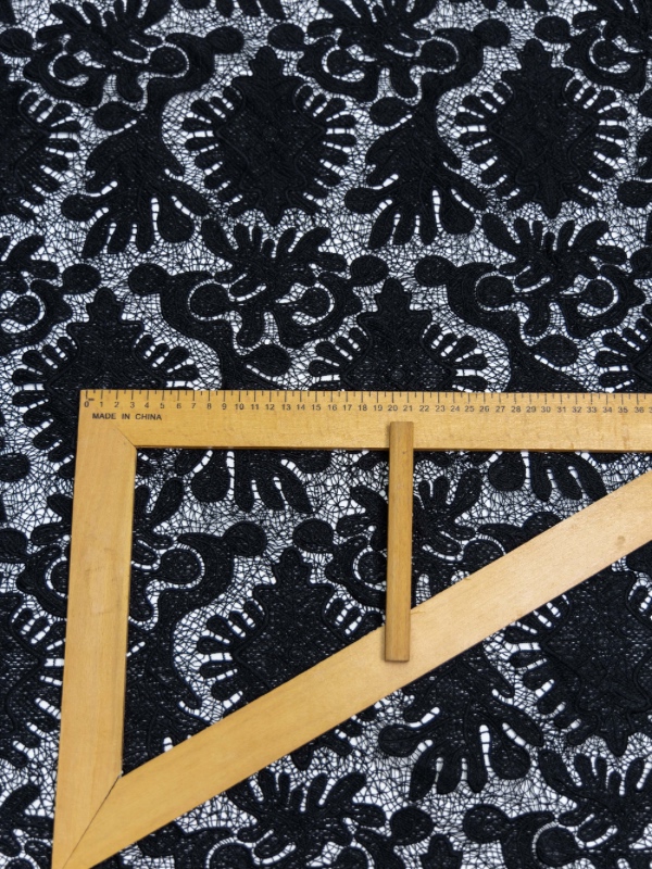 This black embroidered lace fabric is ideal for creating Elegant evening and cocktail dresses, Sophisticated blouses and tops, Fashionable skirts or even Bridal gowns and high-end formalwear