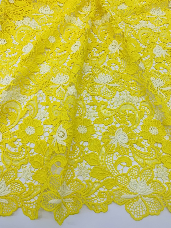 ltem No.: SS211109-EMB17This polyester two-tone water-soluble lace fabric is a perfect blend of intricate floral detailing and eye-catching color. The lace features large, elegant blossoms interwoven with delicate vines, creating a beautiful mix of texture and pattern. The subtle contrast of white and yellow threads adds dimension to the fabric, enhancing its visual appeal.